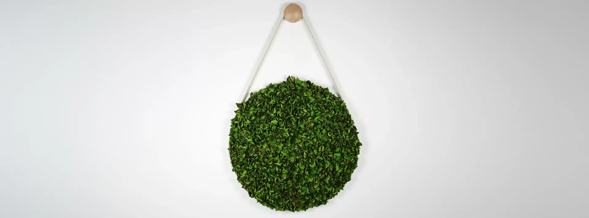 Suspendu par une sangle en laine naturelle et doté d’un dos en feutrine absorbante, chaque disque est garni de mousse ou de feuillage préservés, offrant à la fois une douceur visuelle et un confort acoustique. Simple, intemporel et naturellement biophilique.