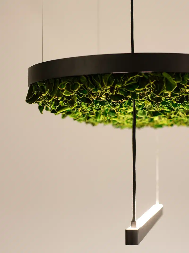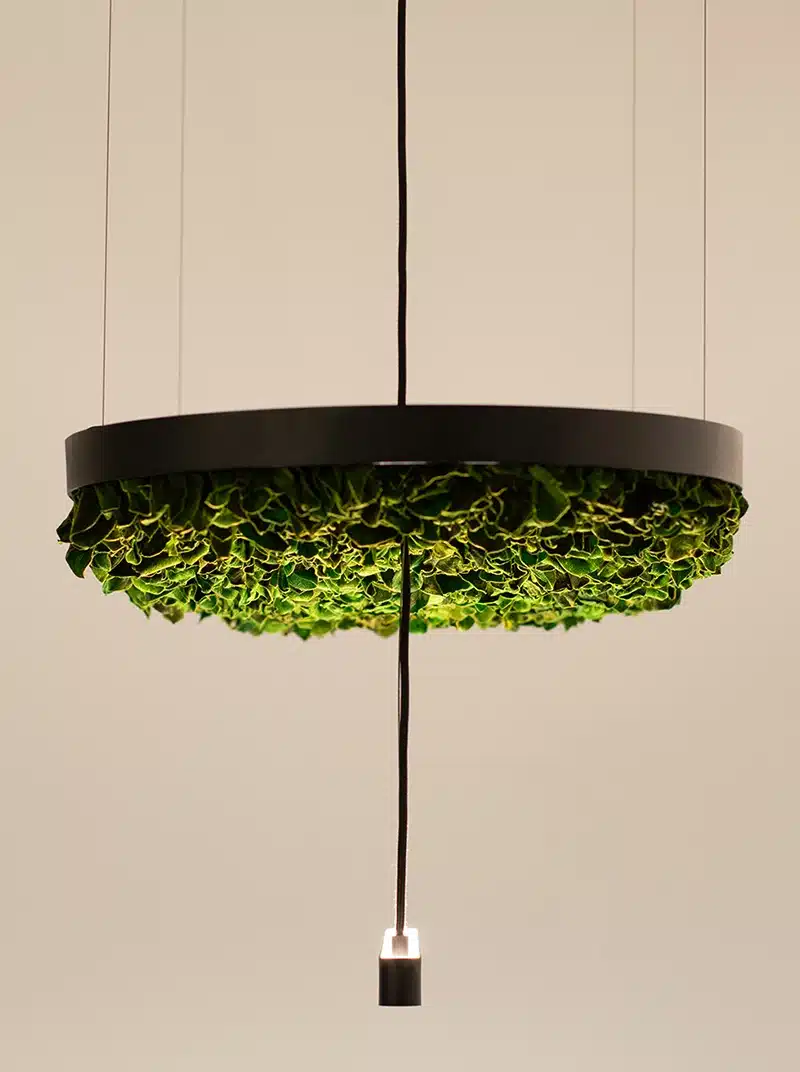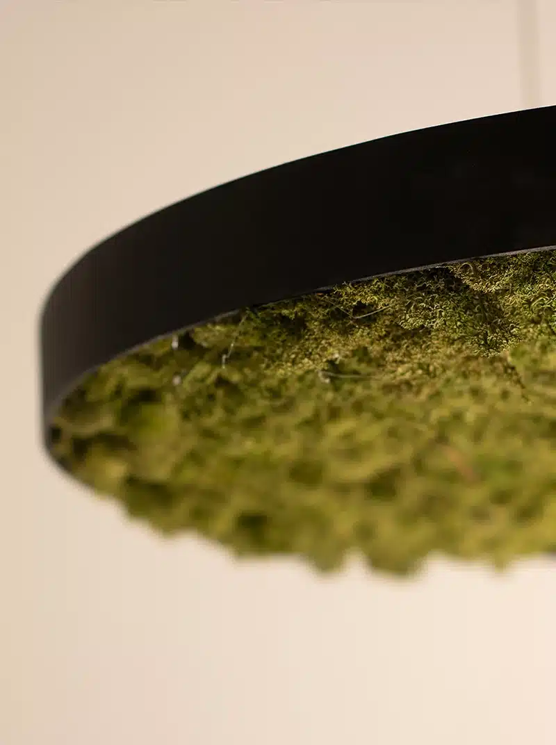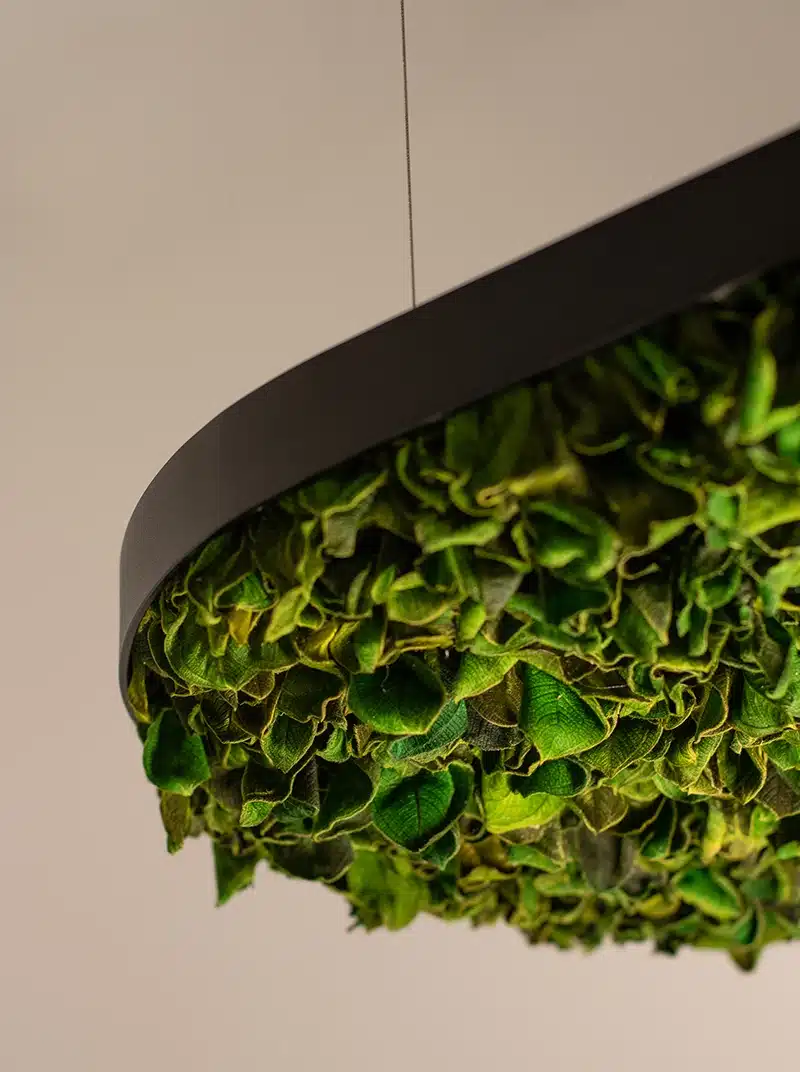 Hoverlight est un luminaire suspendu qui allie design naturel et excellence technique. Conçu pour offrir à la fois un confort acoustique et une lumière douce et ambiante, il intègre un panneau luxuriant de plantes préservées dans un objet lumineux sobre et durable.