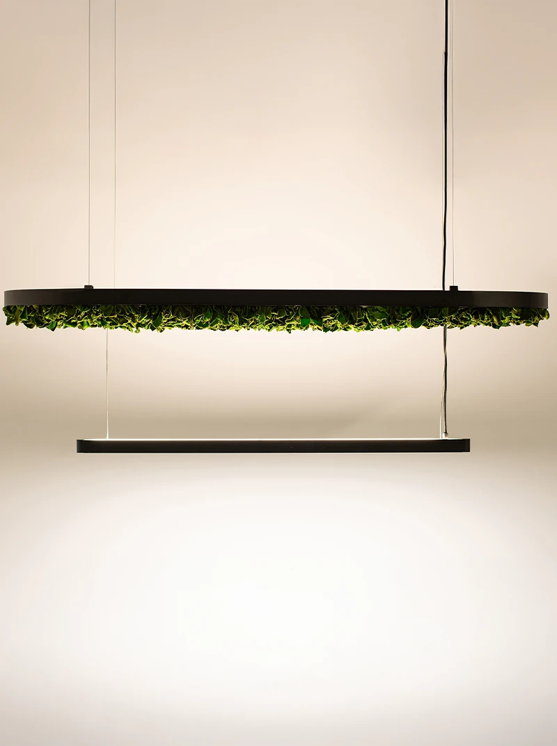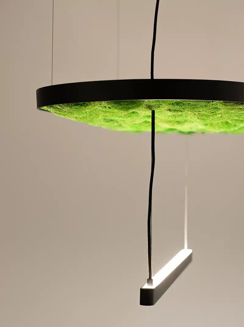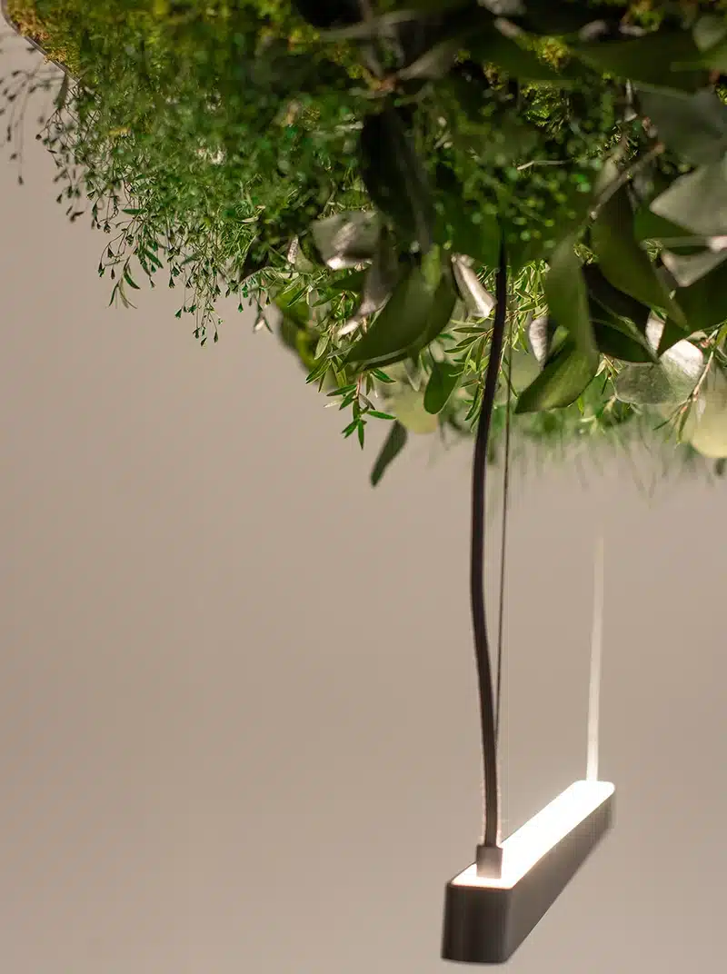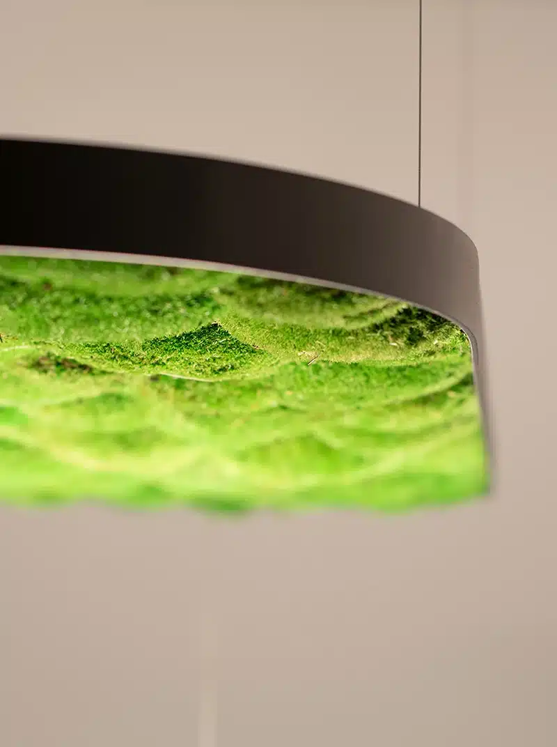 Hoverlight est un luminaire suspendu qui allie design naturel et excellence technique. Conçu pour offrir à la fois un confort acoustique et une lumière douce et ambiante, il intègre un panneau luxuriant de plantes préservées dans un objet lumineux sobre et durable.