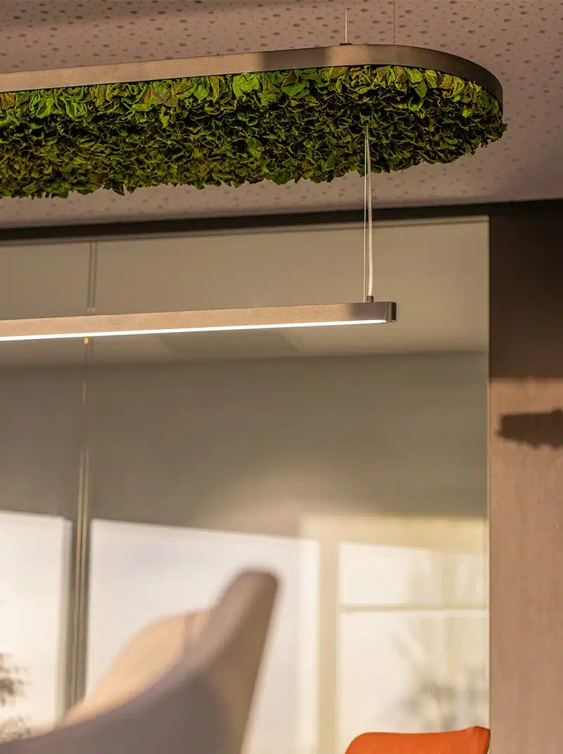 Cette double fonctionnalité renforce à la fois le confort visuel et l’absorption sonore, grâce aux propriétés acoustiques naturelles des plantes préservées.