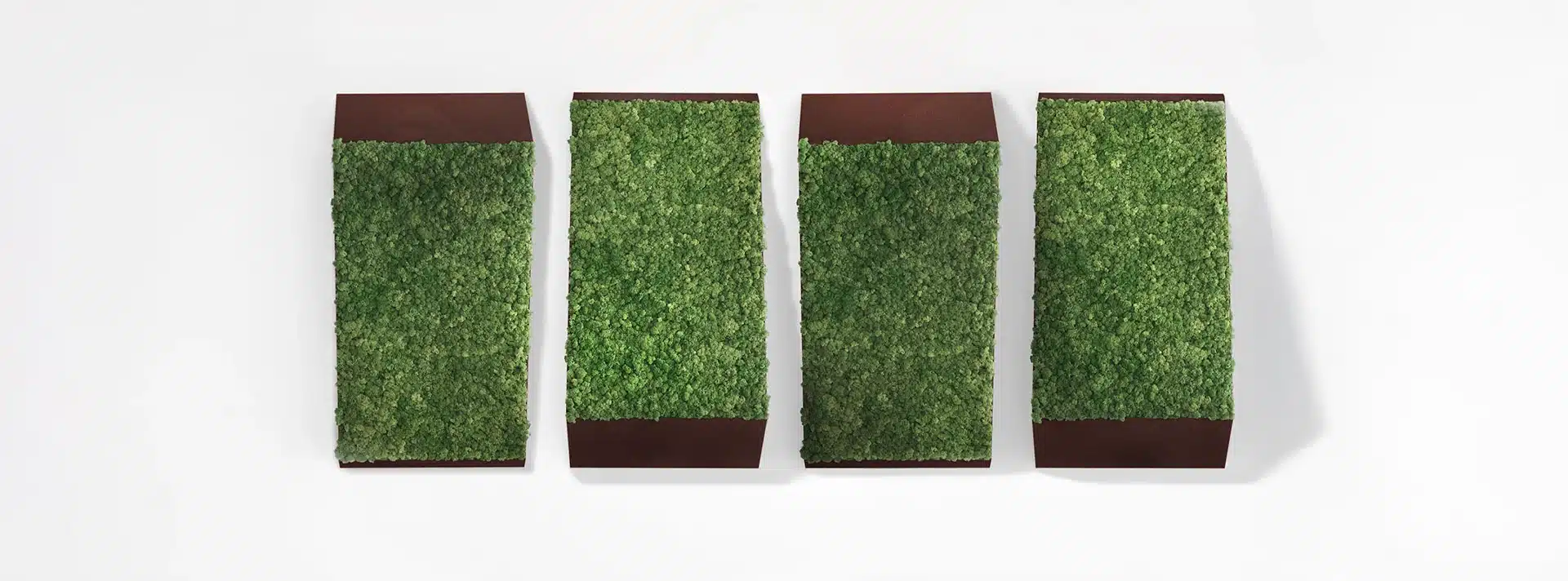 Chaque module est en aluminium thermolaqué et peut être garni de la mousse ou du feuillage de votre choix. Les caissons se posent verticalement, horizontalement ou en alternance pour former des motifs et textures uniques.