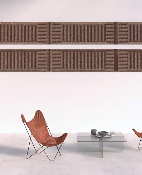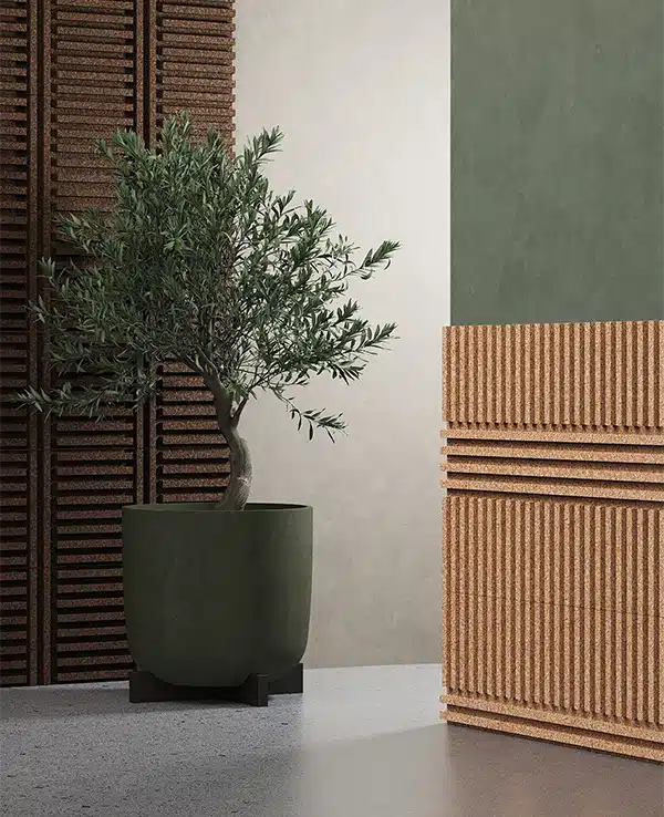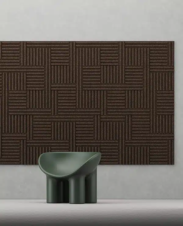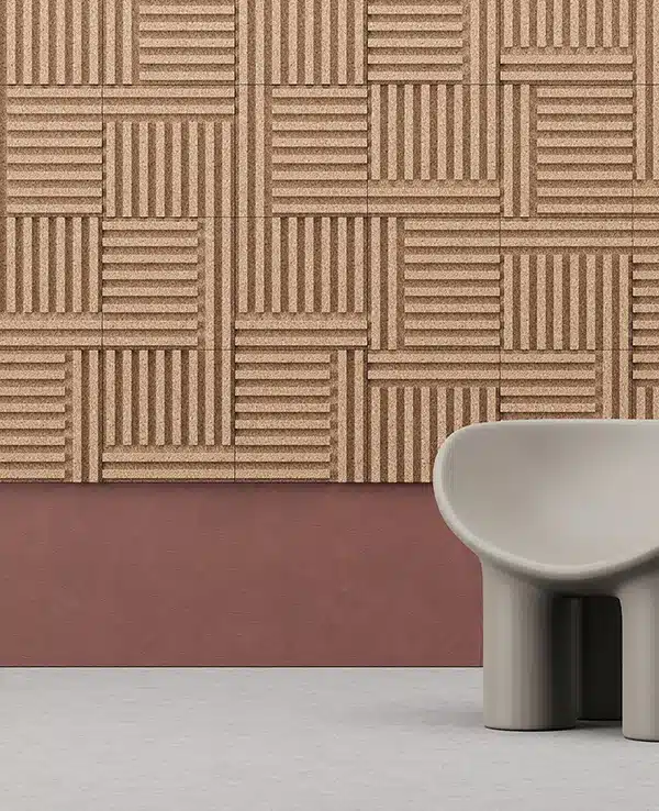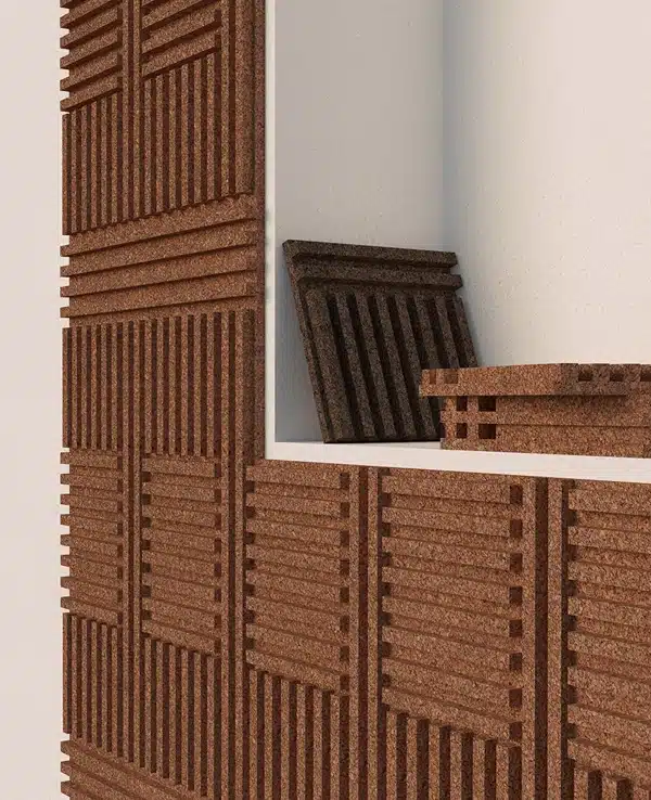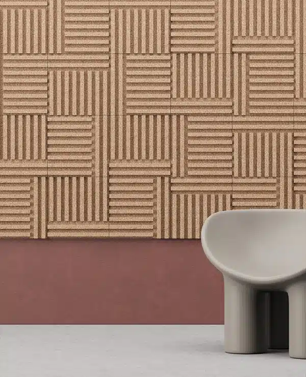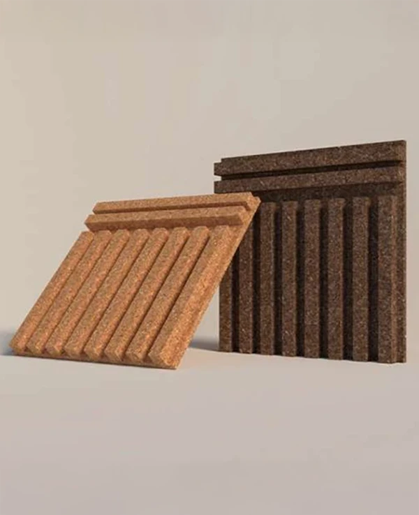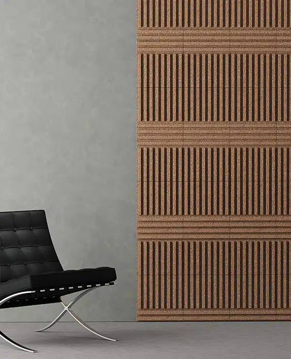Sillon, qui signifie « groove » en français, est un panneau de liège modulaire conçu pour créer des murs acoustiques continus et à grande échelle.